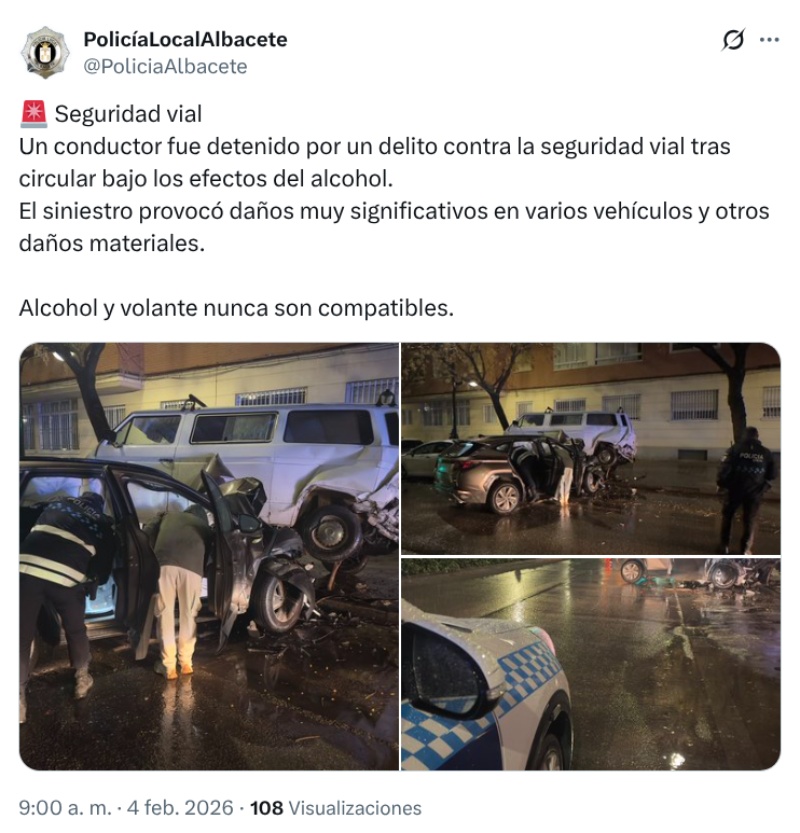 Los hechos han ocurrido en la madrugada de este miércoles, a las 05:11 horas, en la calle La Roda, según ha informado la Policía Local de Albacete, quienes recuerdan: «Alcohol y volante nunca son compatibles».