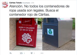 Cáritas avisa en Twitter: “No todos los contenedores de ropa usada son legales. Busca el contenedor rojo”