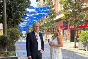 Instalan 1.500 paraguas blancos y azules por el calor en una de las calles principales de Talavera