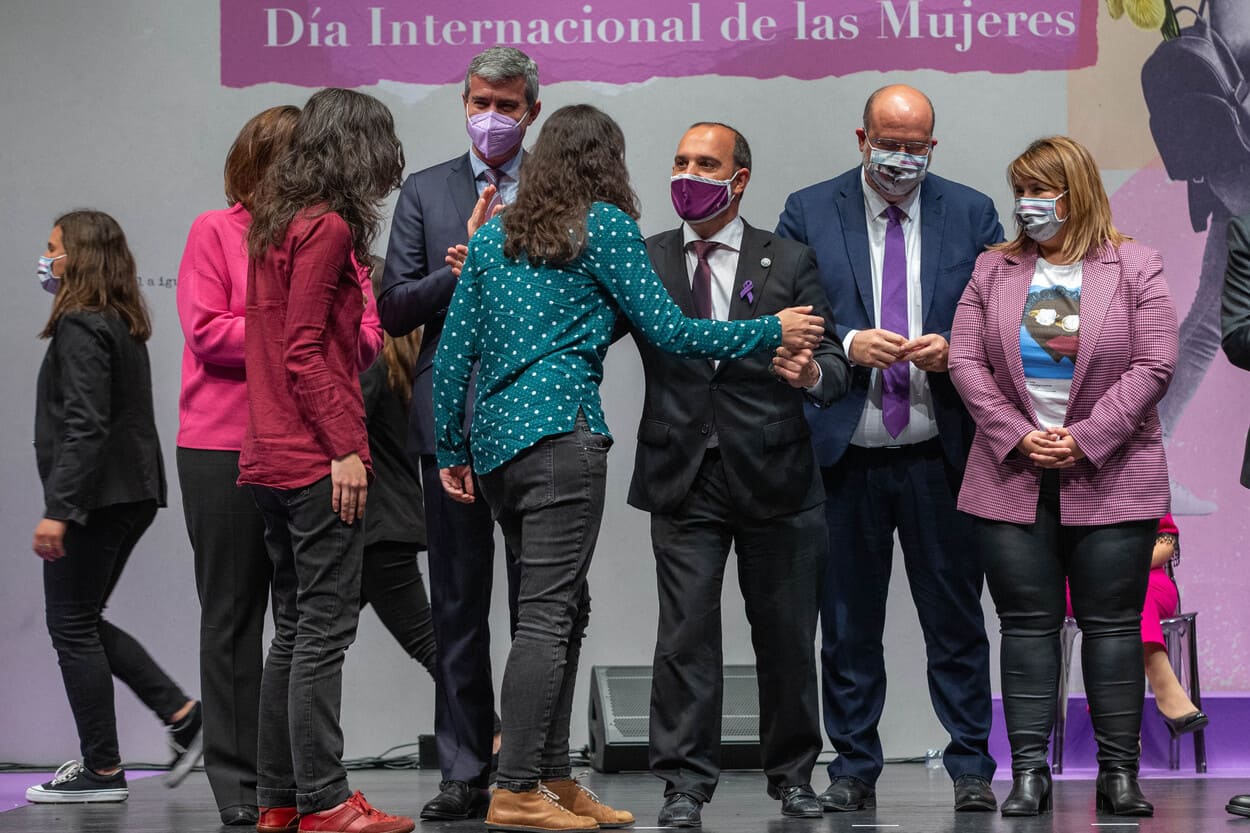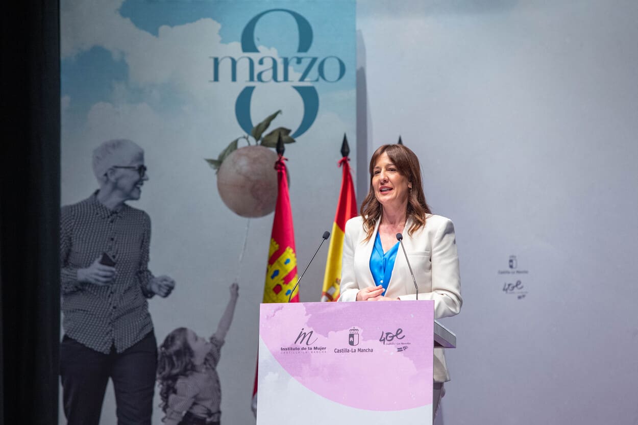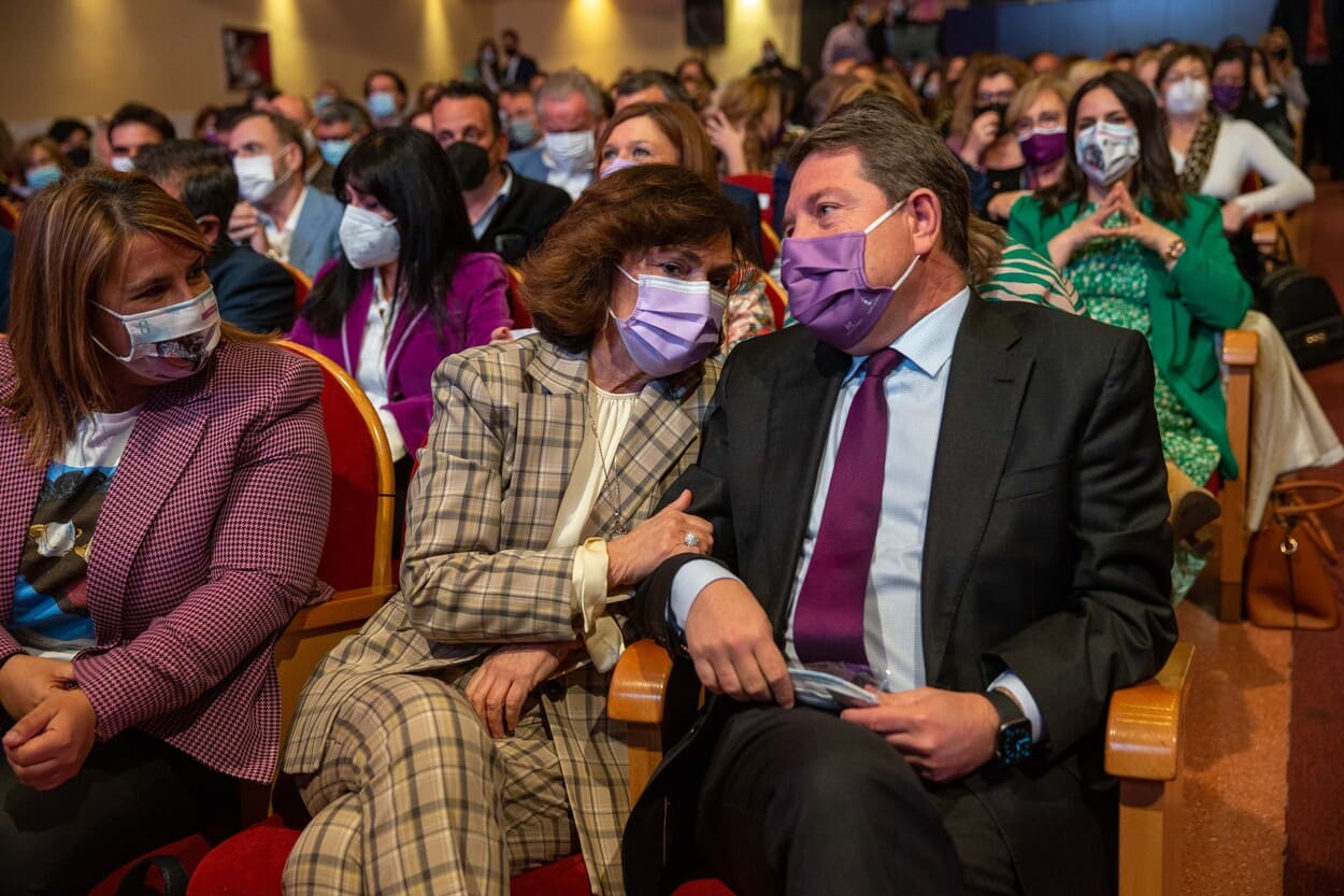 Calvo se ha mostrado muy agradecida tanto al presidente de Castilla-La Mancha, Emiliano García-Page, como a las instituciones de la región por «vestirse de gala» este lunes para celebrar de forma solemne el 8M, algo que a su entender, es «una clara vara de medir de cómo está evolucionado la democracia y el país».