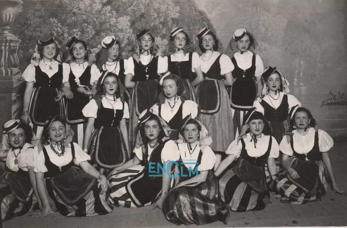 - Mercedes, la primera por la derecha en la fila de abajo, junto con uno de los grupos que organizaba de baile.