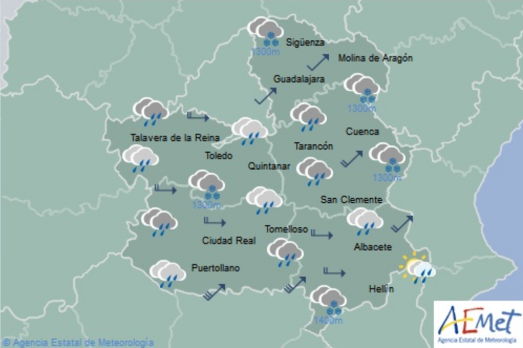 Las temperaturas se mantendrán sin cambios en el extremo sureste y estarán en descenso en el resto, más acusado el de las máximas, que se quedarán en 7 grados en Cuenca, 10 en Guadalajara, 11 en Albacete, 12 grados en Toledo y 13 en Ciudad Real.