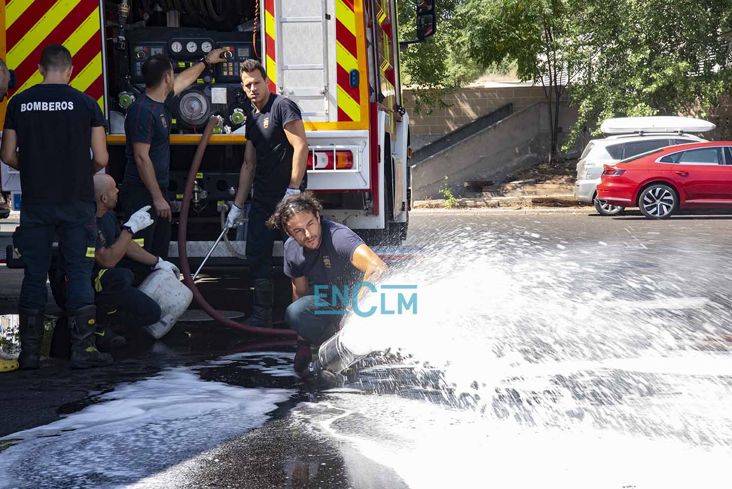 Los Bomberos de Toledo, probando una manguera. Foto: Rebeca Arango.