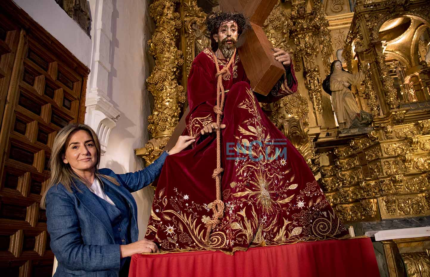 - Milagros Tolón, alcaldesa de Toledo, junto a la imagen del Cristo Redentor, en el monasterio de Santo Domingo el Real. Foto: Rebeca Arango.