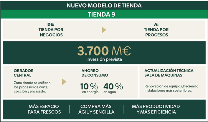 Mercadona va a invertir en los próximos años 3.700 millones de euros para transformar sus supermercados en Tienda 9, modelo que gestionará por procesos en lugar de por negocios, con más espacio para los productos frescos, y una compra más ágil y sencilla para los “Jefes”, incrementado la productividad, rentabilidad y eficiencia. Entre las principales novedades, este modelo optimiza los procesos de corte, cocción y envasado, unificándolos en una sola zona denominada Obrador Central, que genera un ahorro del 10% en energía y un 40% en agua. Además, incluye una actualización técnica de la sala de máquinas.
