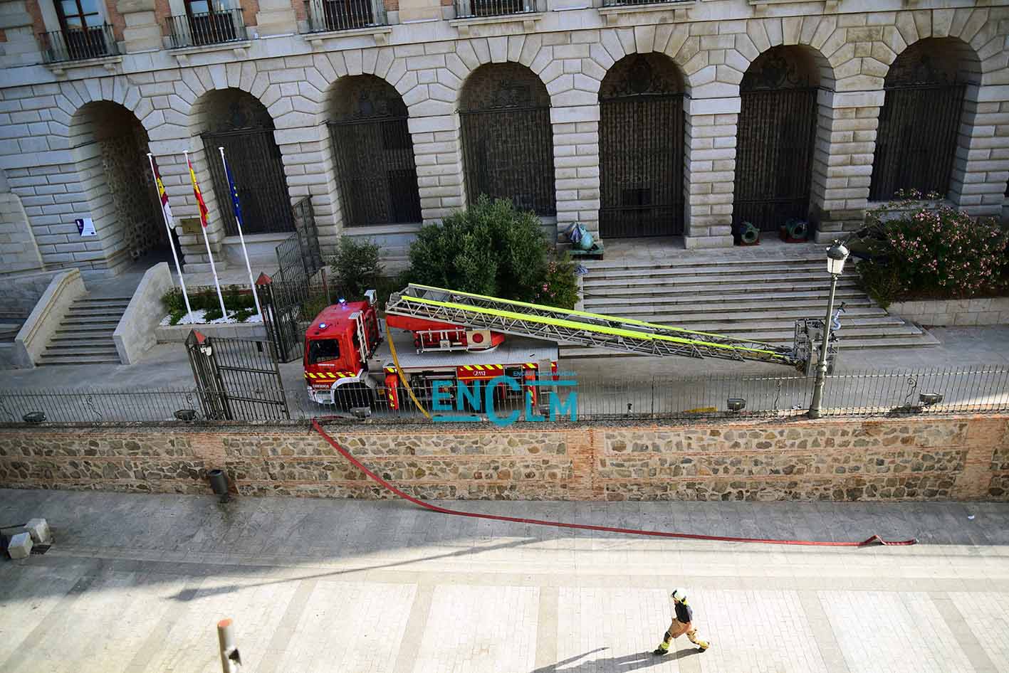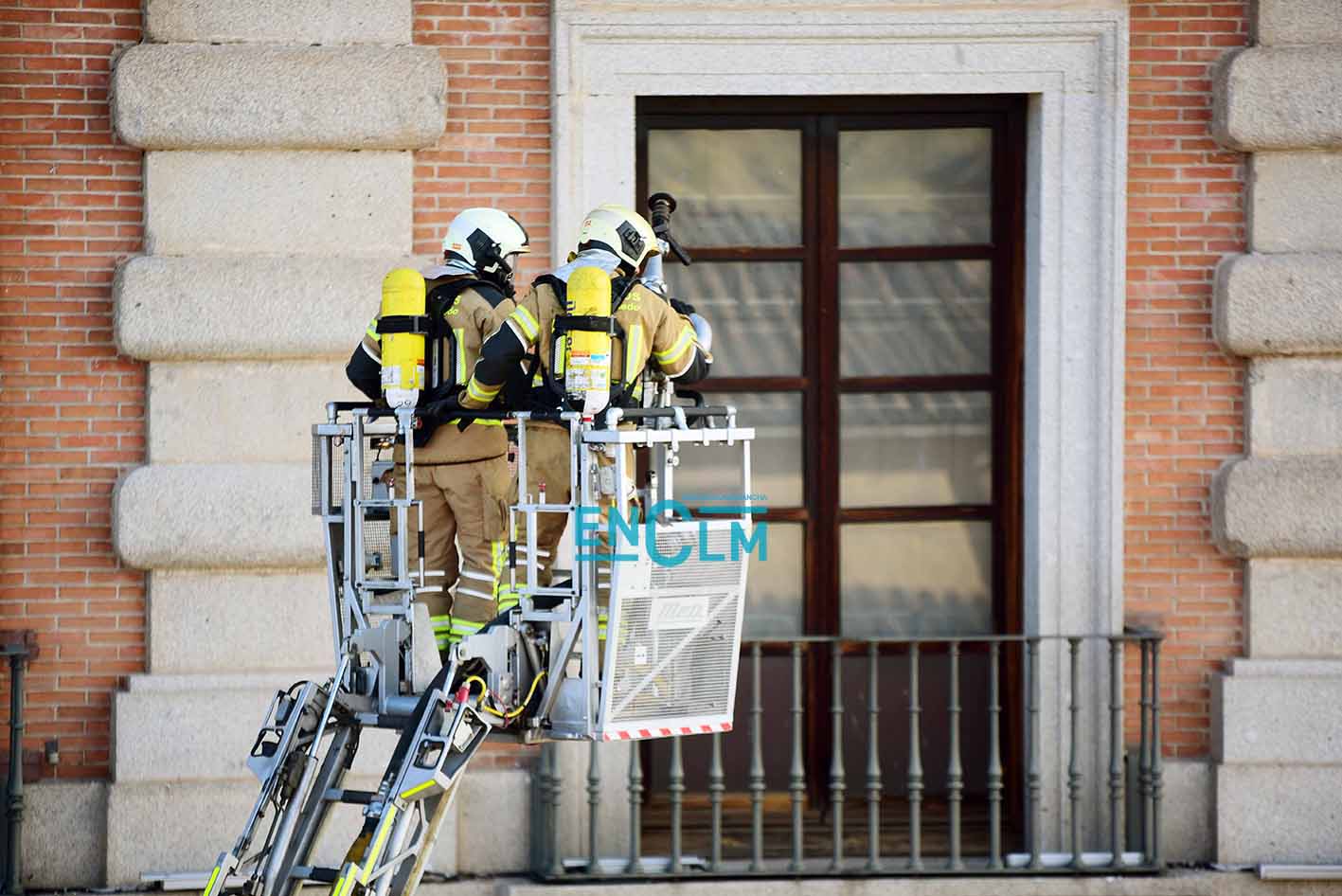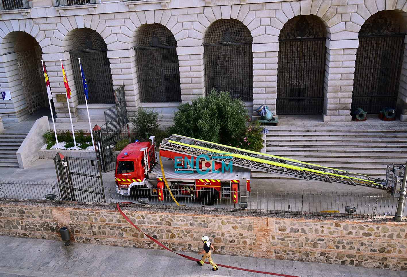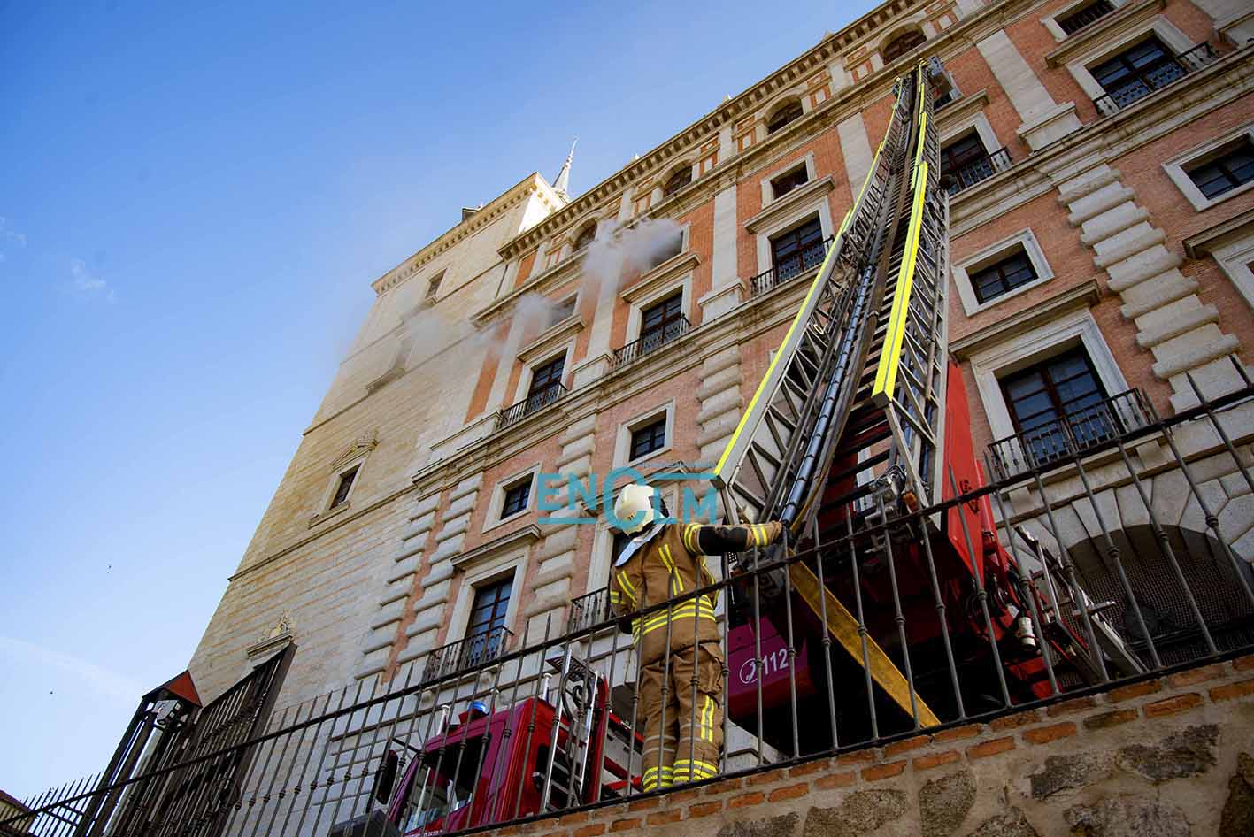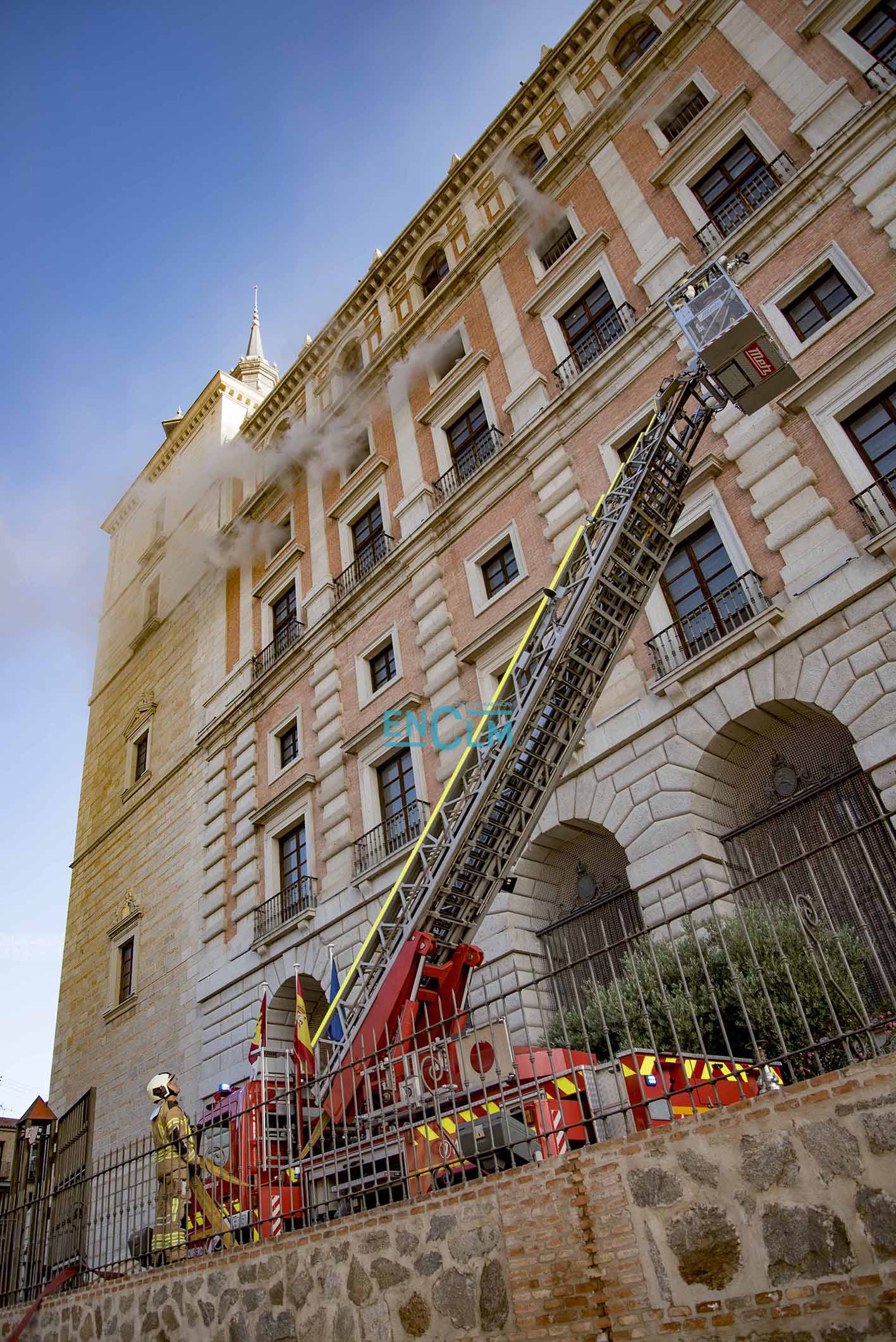 - Bomberos de Toledo, en la fachada del Alcázar de la capital regional. Foto: Rebeca Arango.