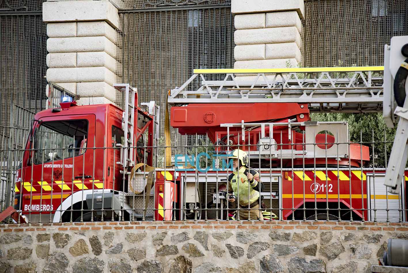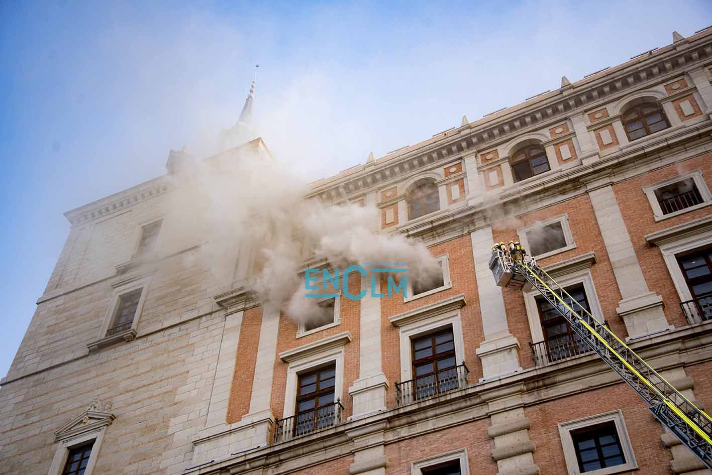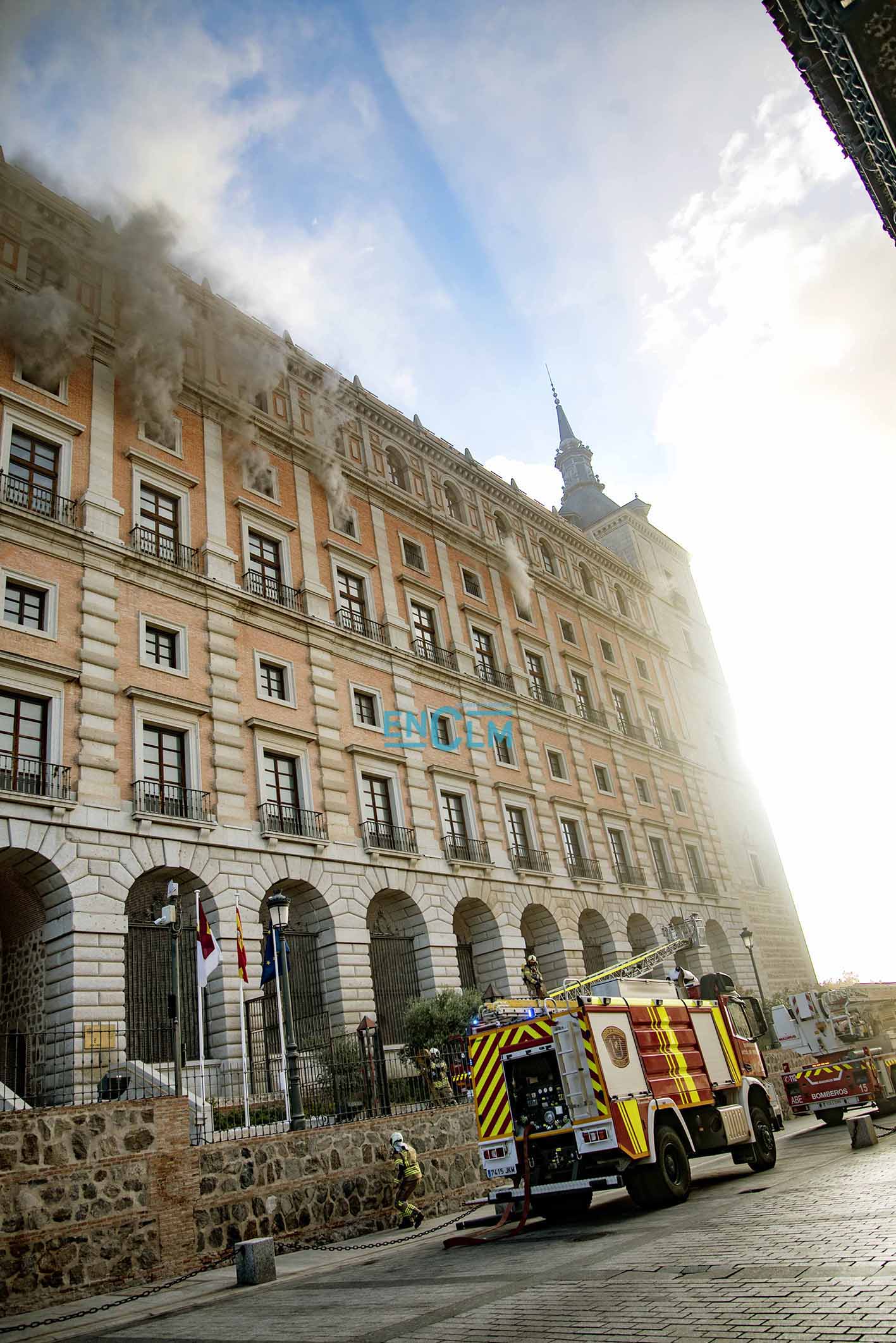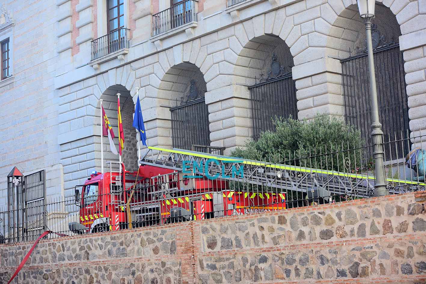 - Bomberos de Toledo, en la fachada del Alcázar de la capital regional. Foto: Rebeca Arango.