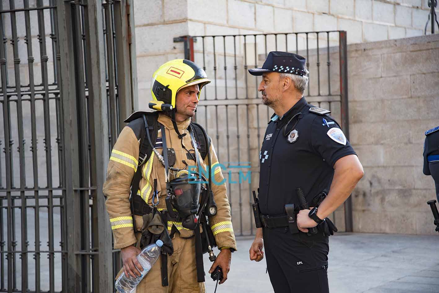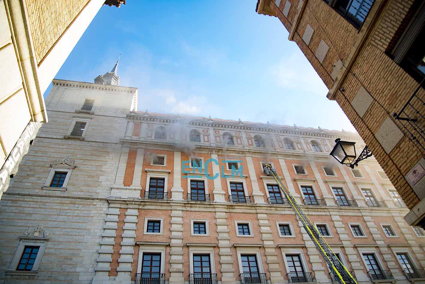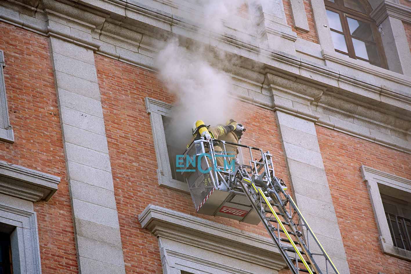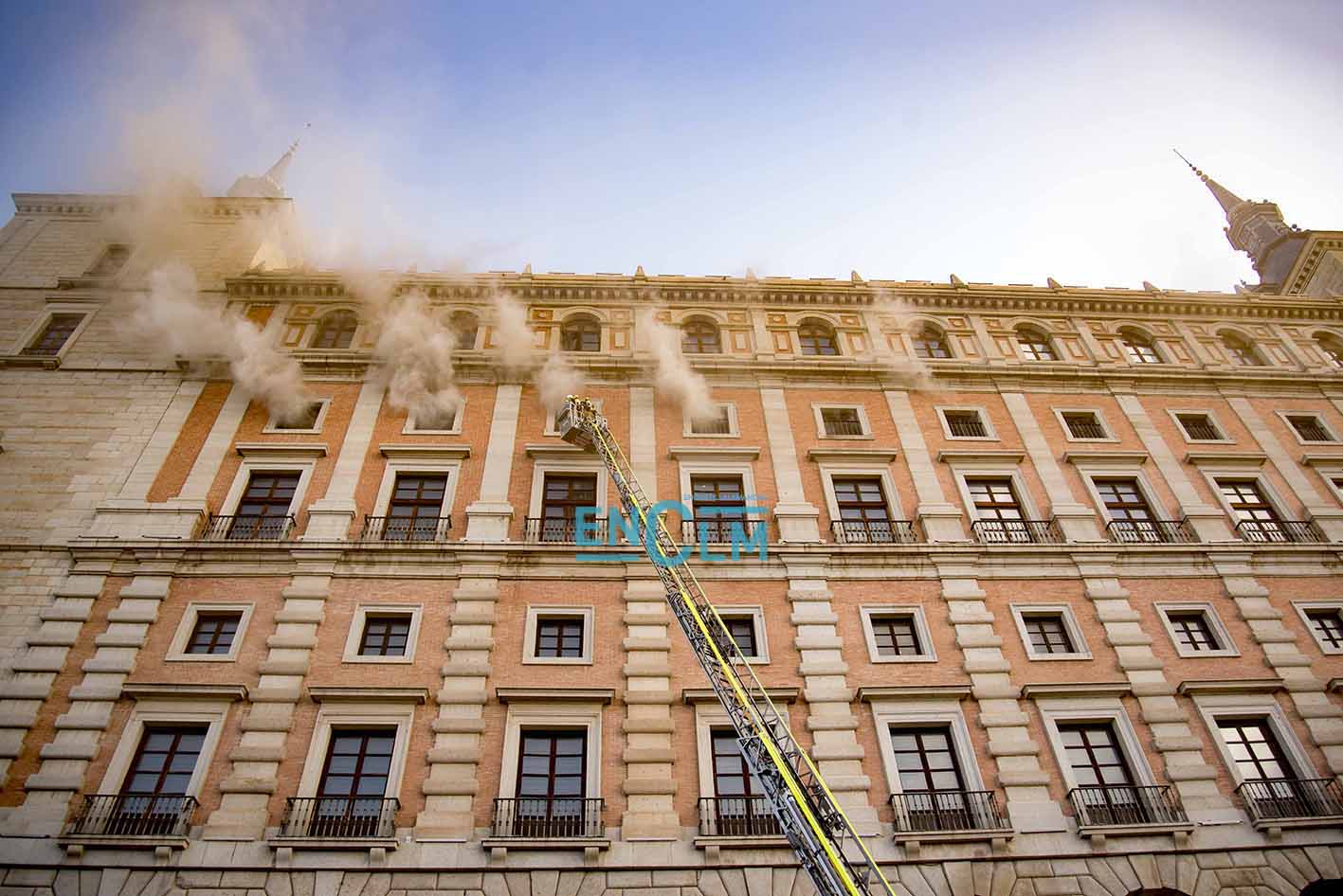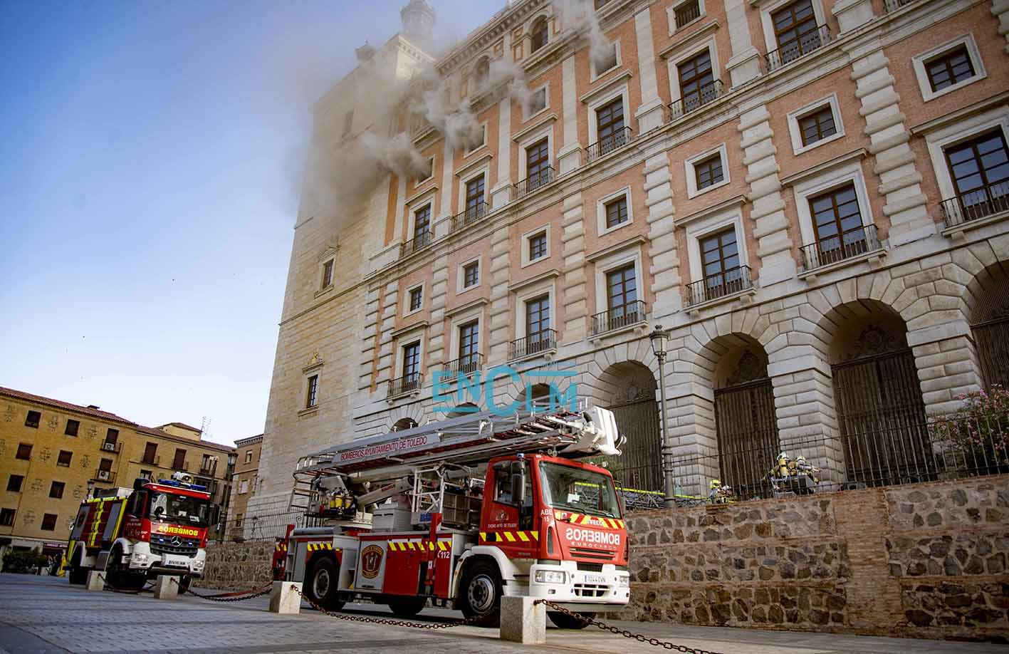 - Bomberos de Toledo, en la fachada del Alcázar de la capital regional. Foto: Rebeca Arango.