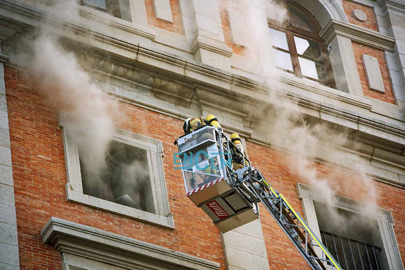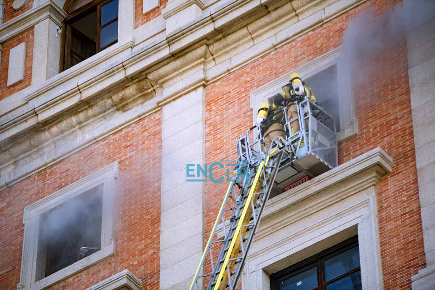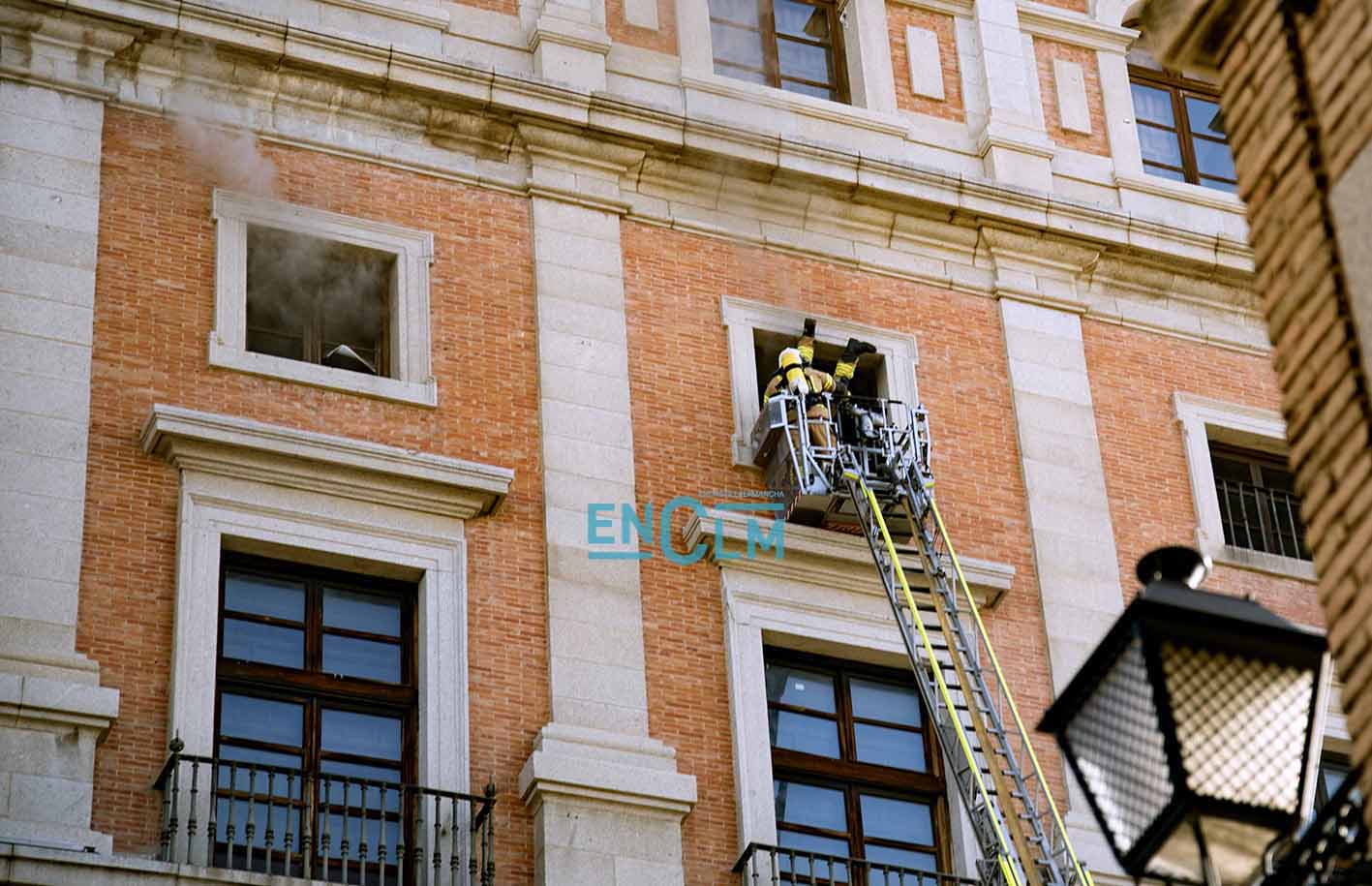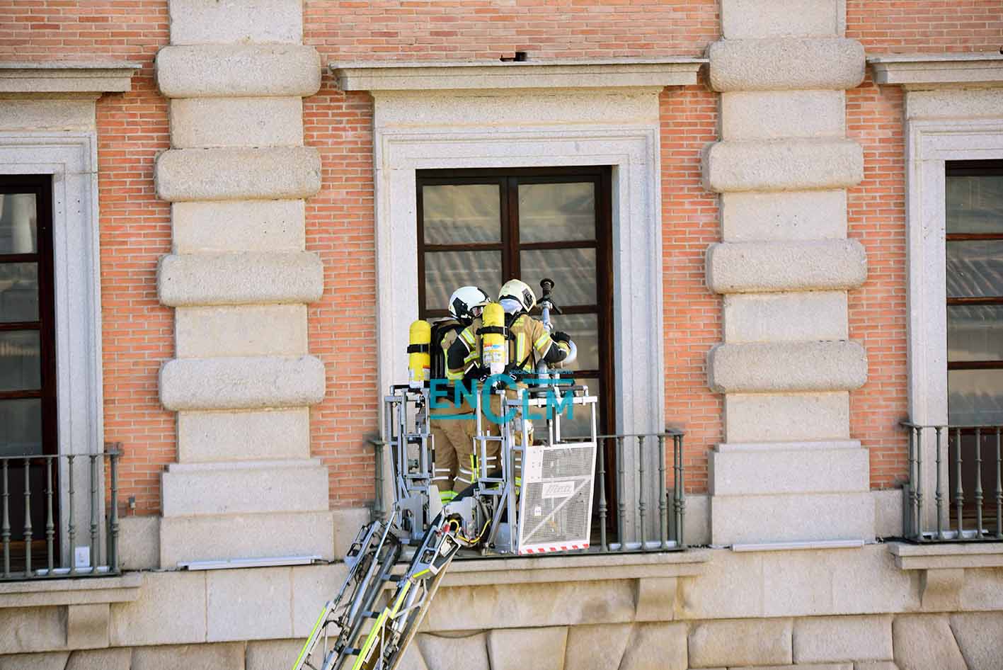 - Los Bomberos del Ayuntamiento de Toledo en las ventanas del Alcázar. Foto: Rebeca Arango.