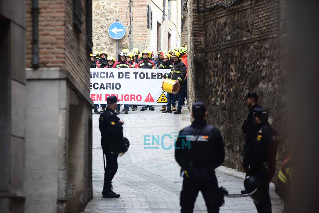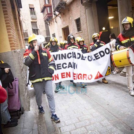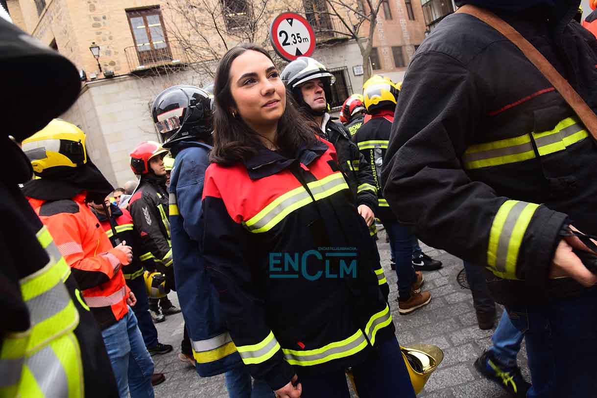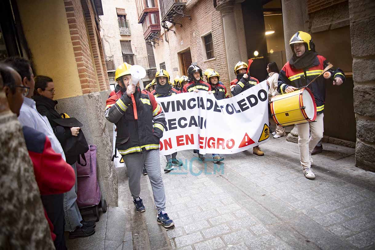 Los bomberos, manifestándose en el casco histórico de Toledo. Foto: Rebeca Arango.