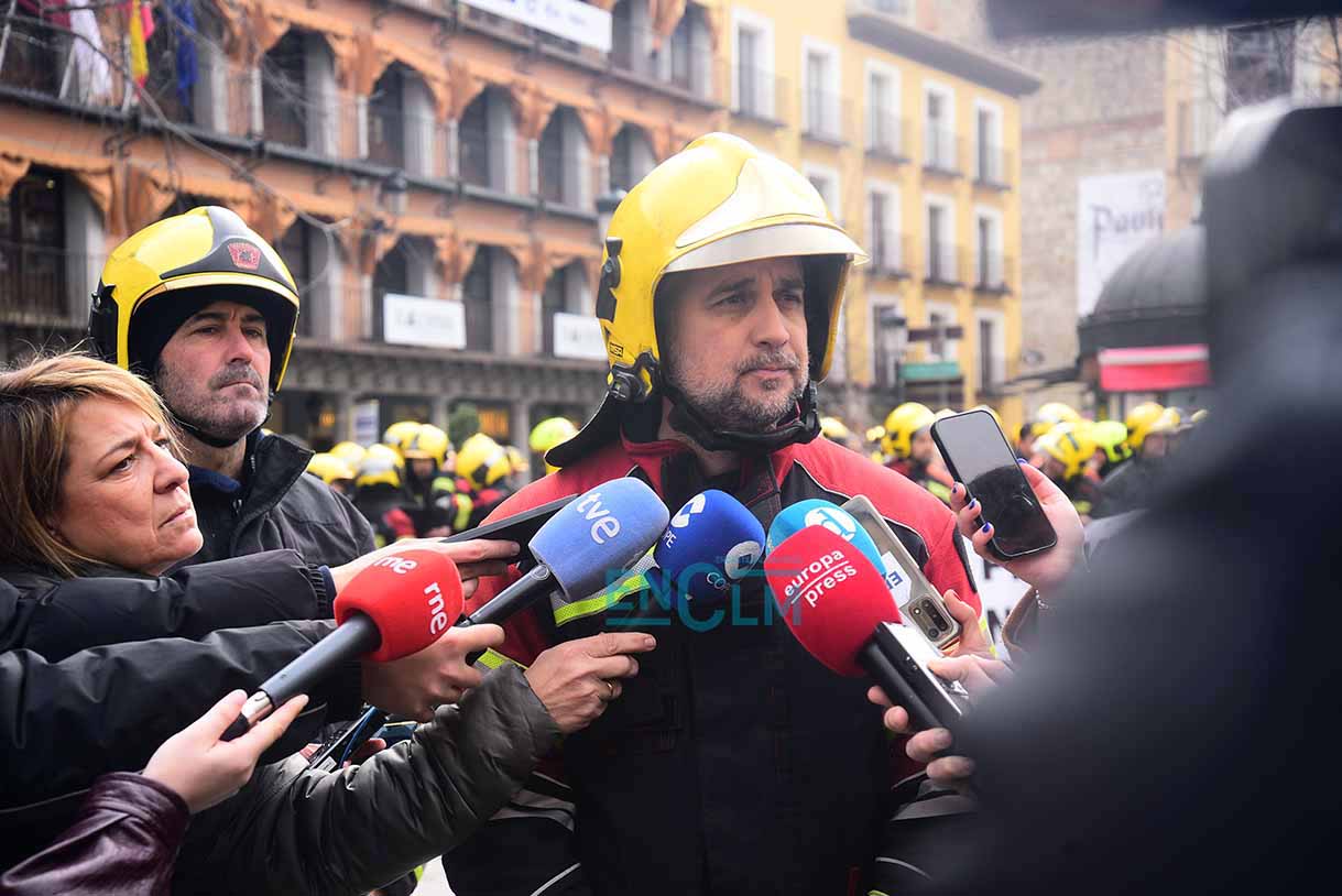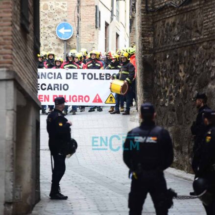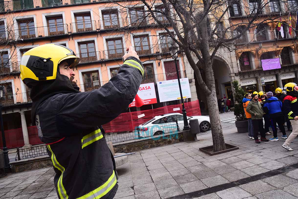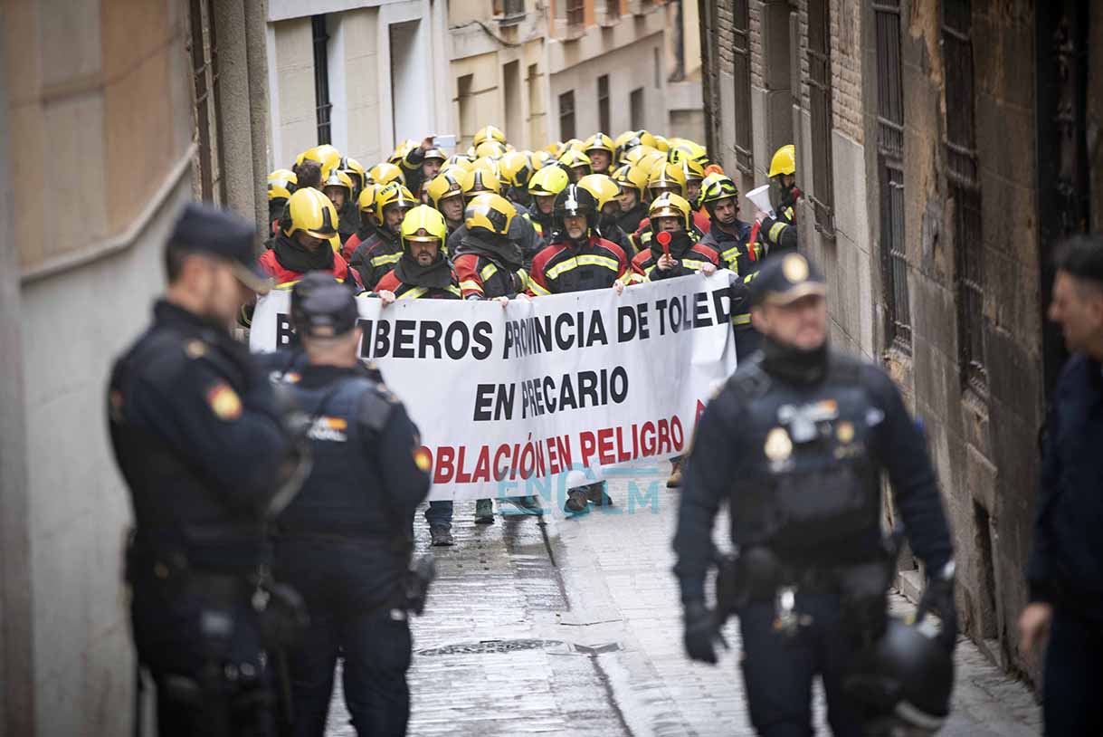 Los bomberos, manifestándose en el casco histórico de Toledo. Foto: Rebeca Arango.