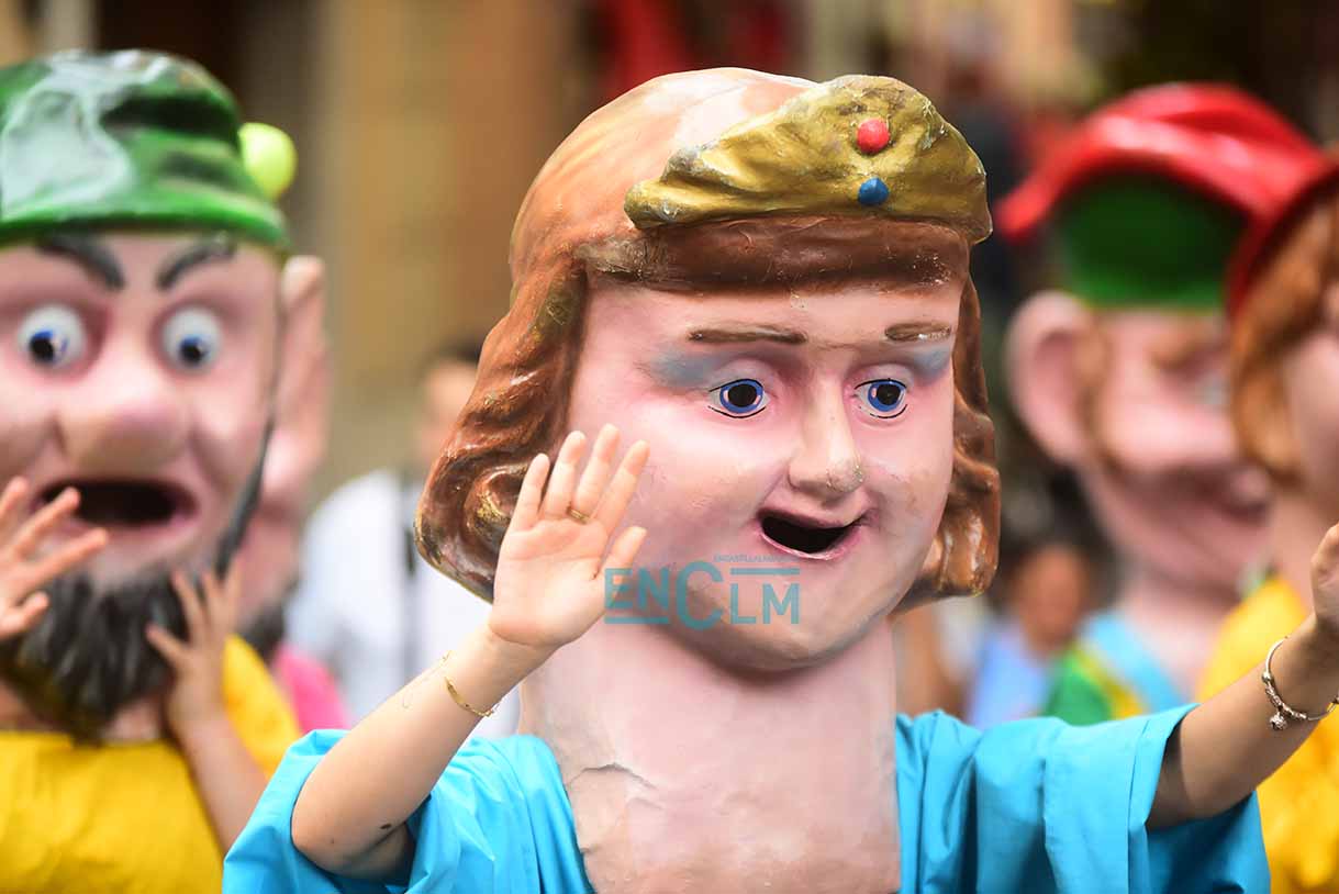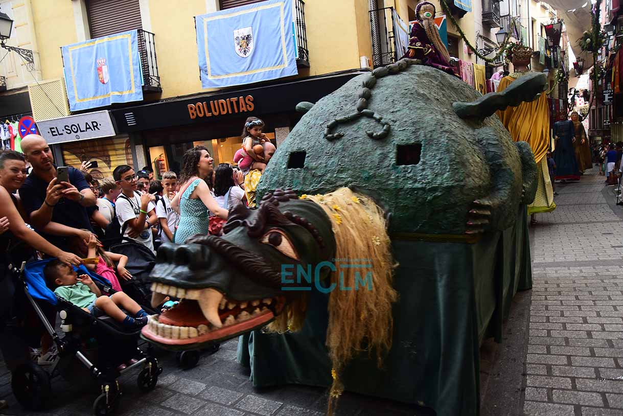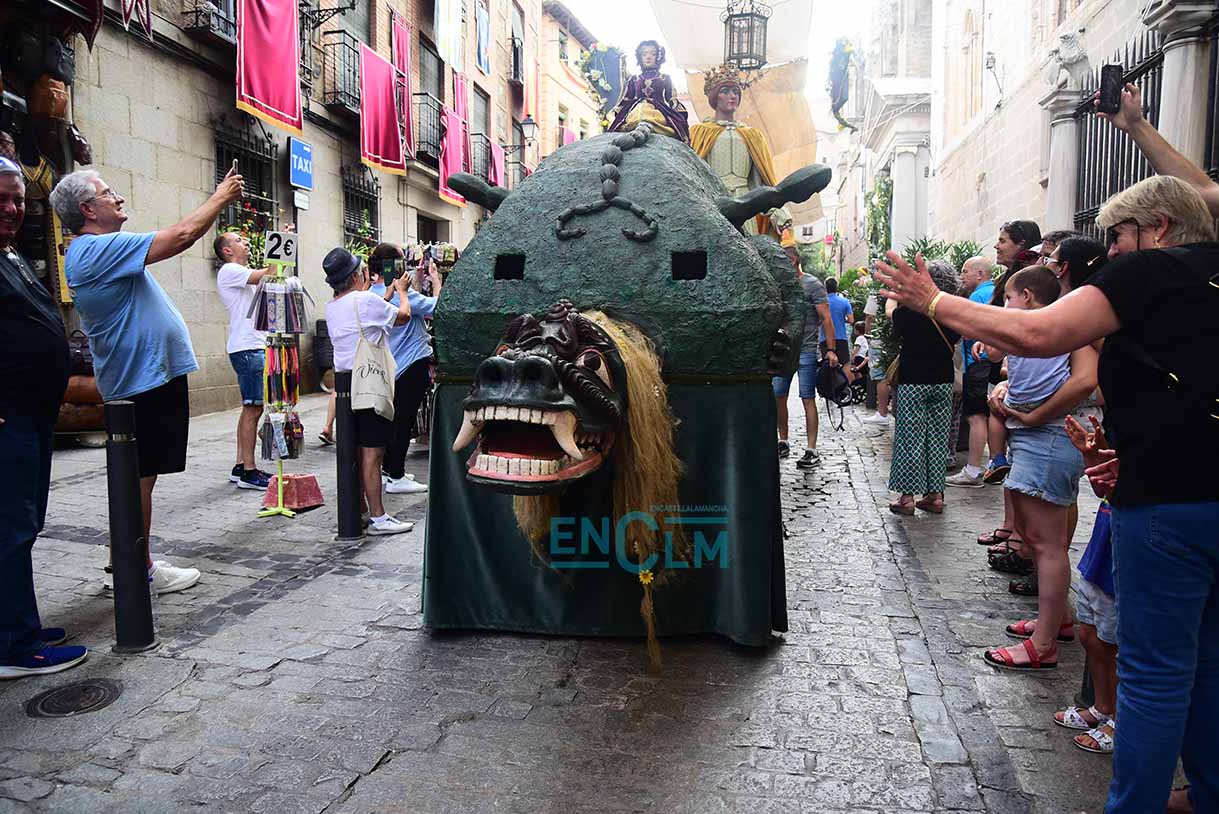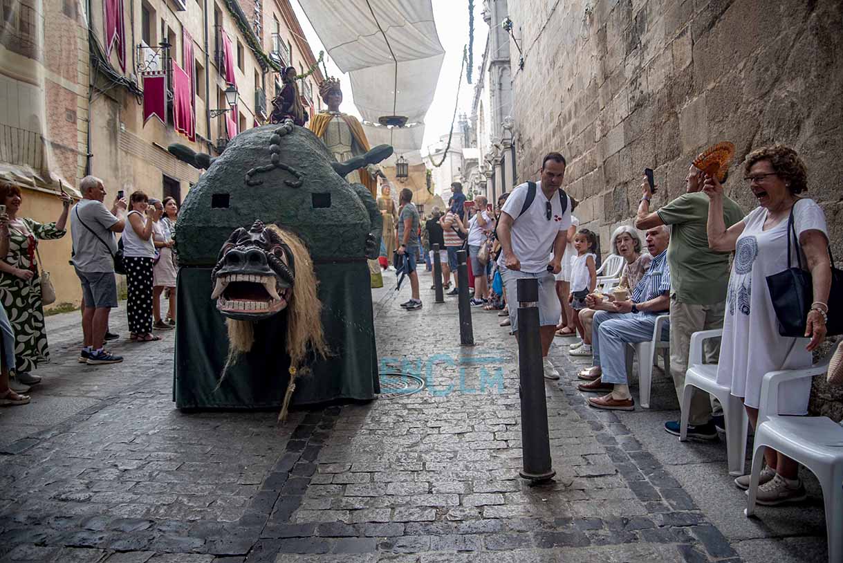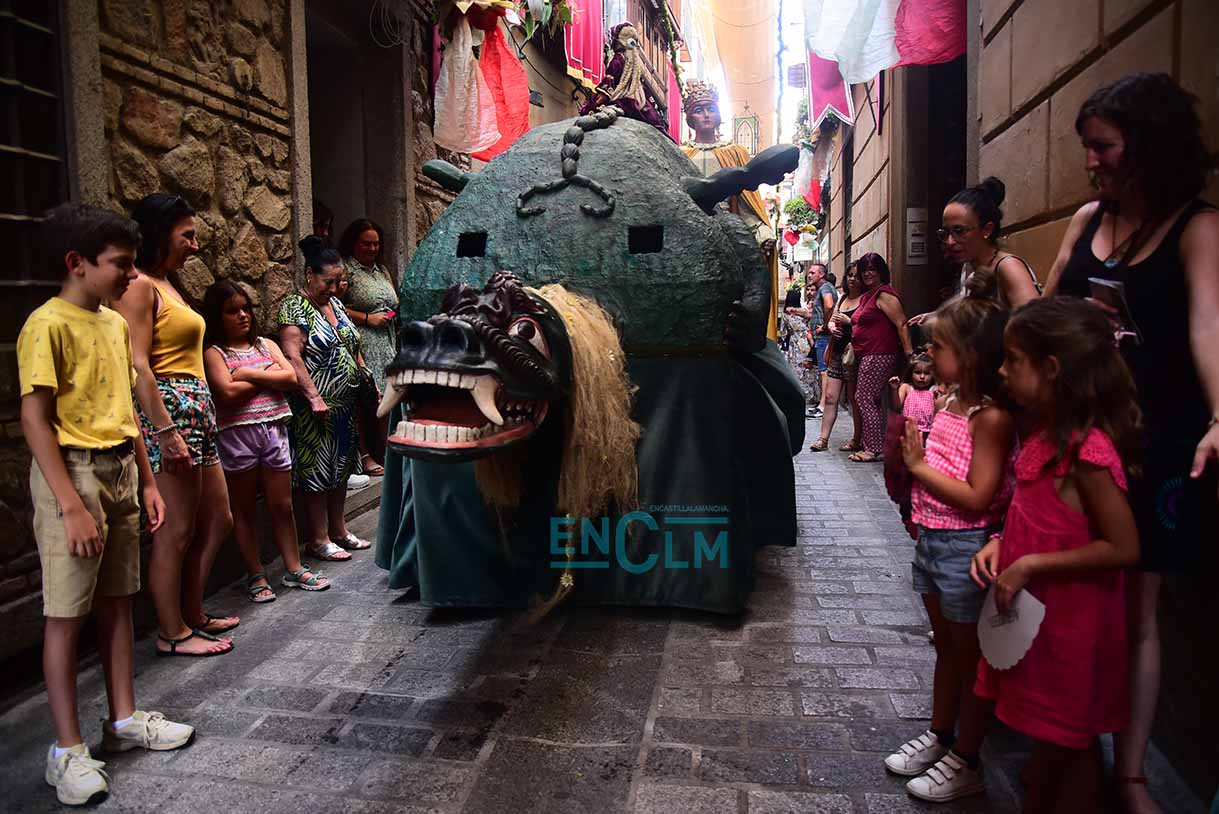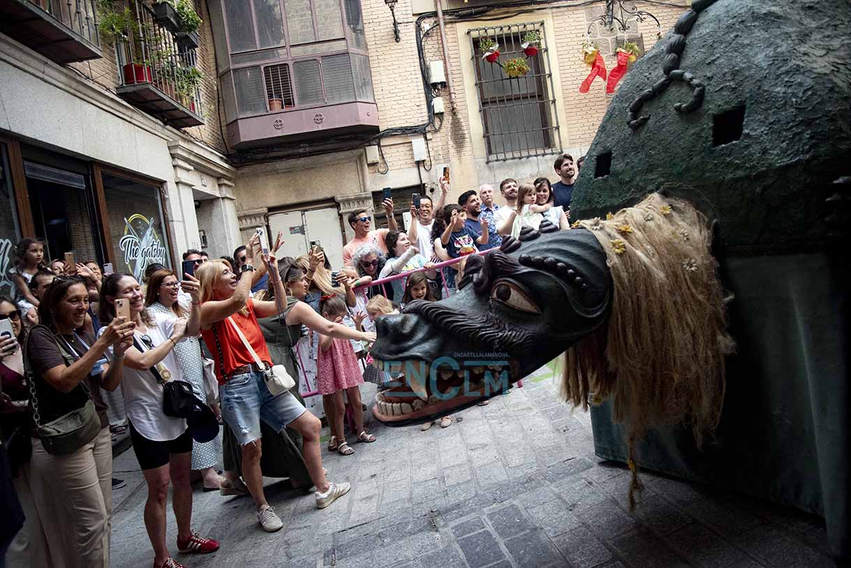 Fotos | La Tarasca, acompañada de Gigantes y Cabezudos, divirtió y refrescó en la calurosa tarde de Toledo