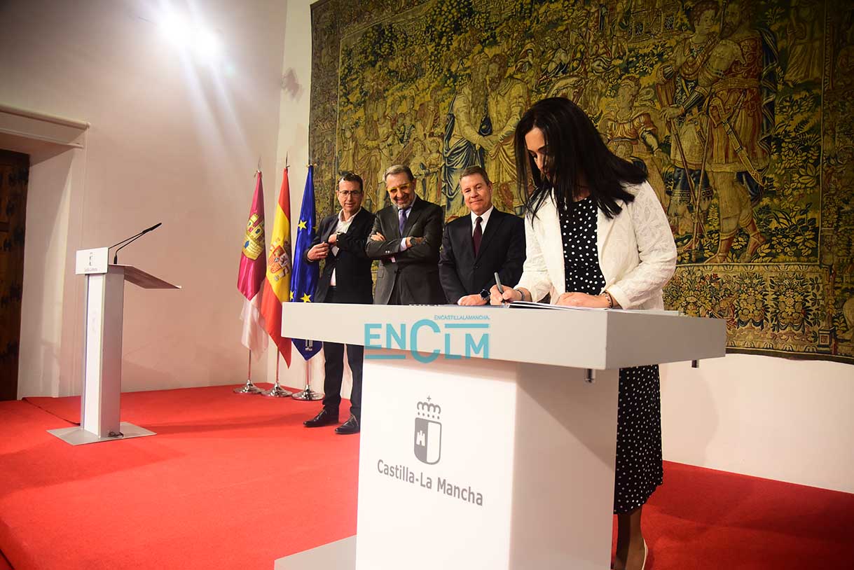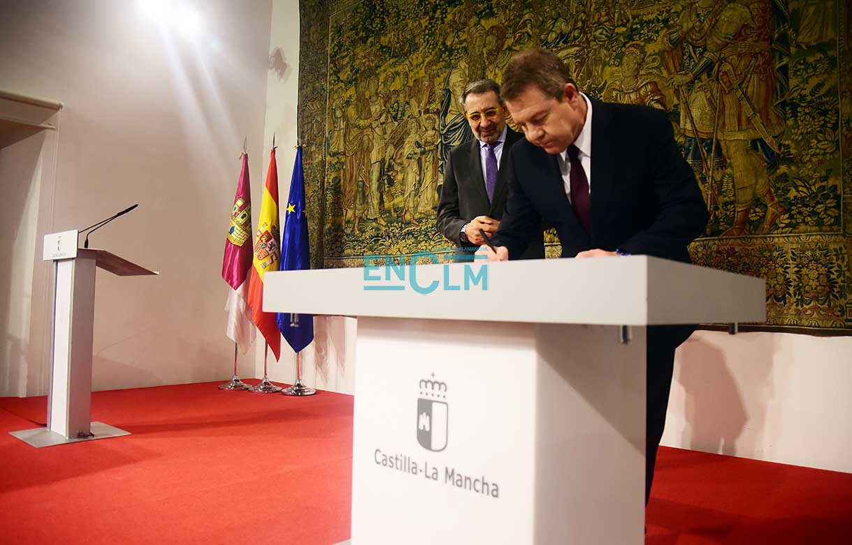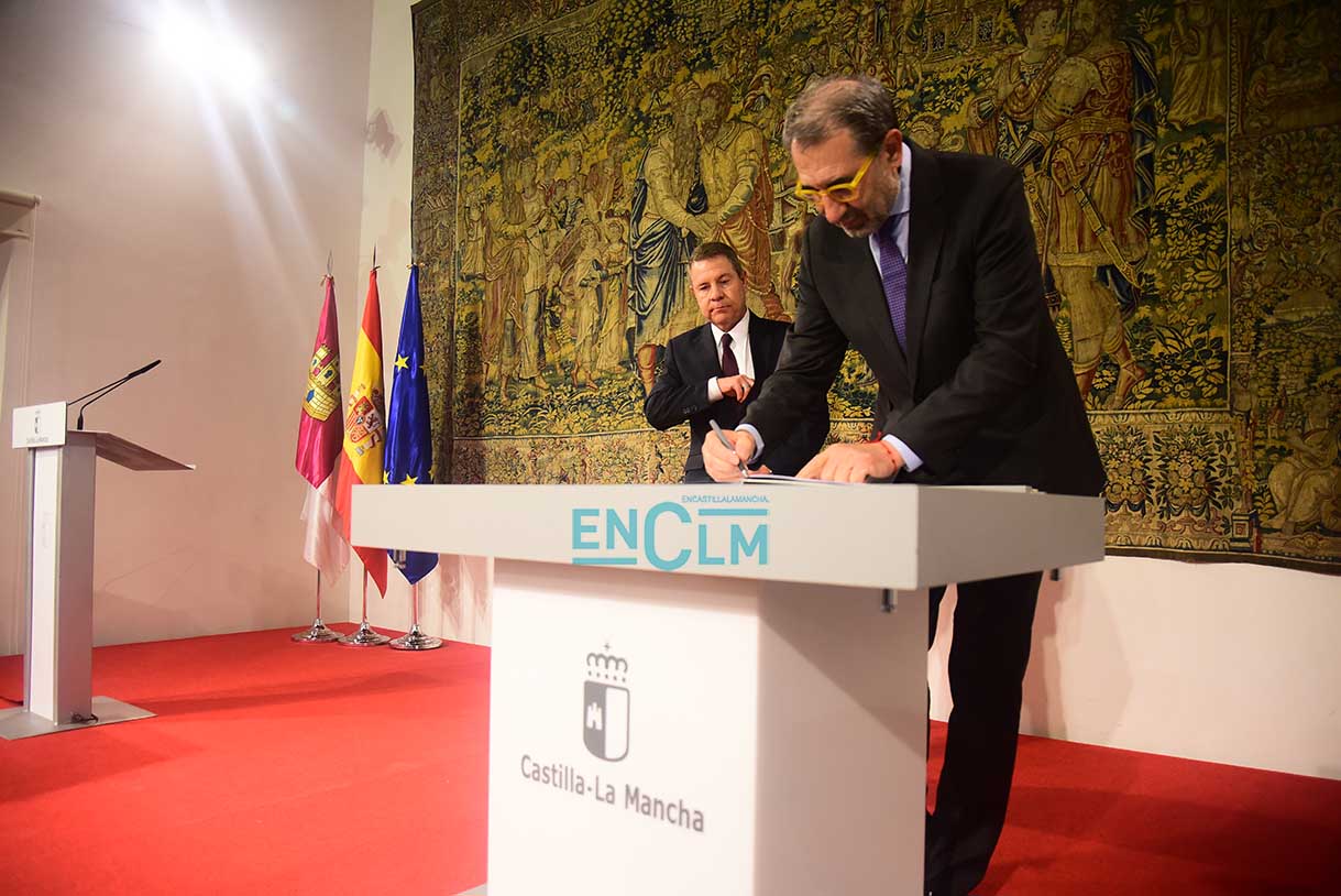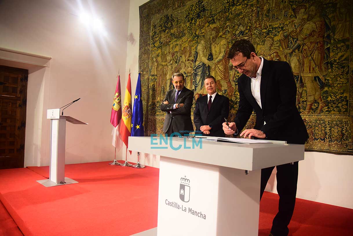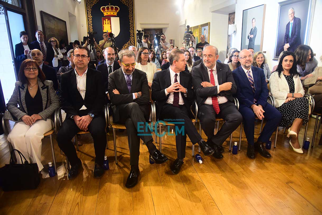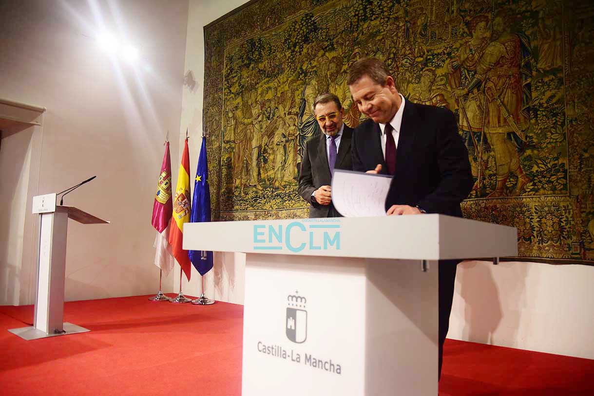 El presidente de la región, Emiliano García-Page. ha presidido la firma, en la que han participado el consejero de Sanidad, Jesús Fernández Sanz, y a representantes de los sindicatos del sector: CESM, CCOO, UGT, CSIF, USAE y SATSE. Fotografías: Rebeca Arango