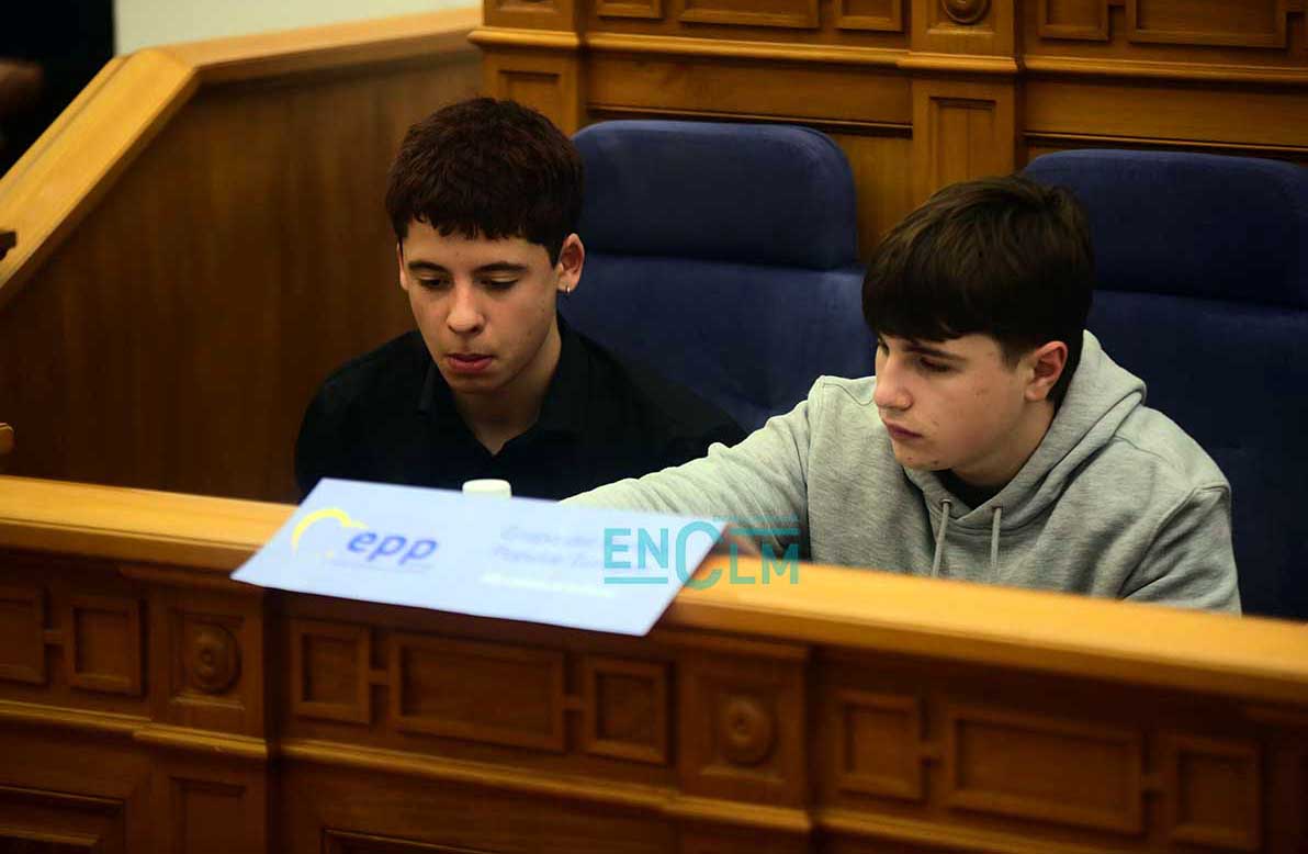 Portada » Fotogalería » Fotos | Alumnos de institutos dan vida en las Cortes de CLM a un simulado pleno del Parlamento Europeo