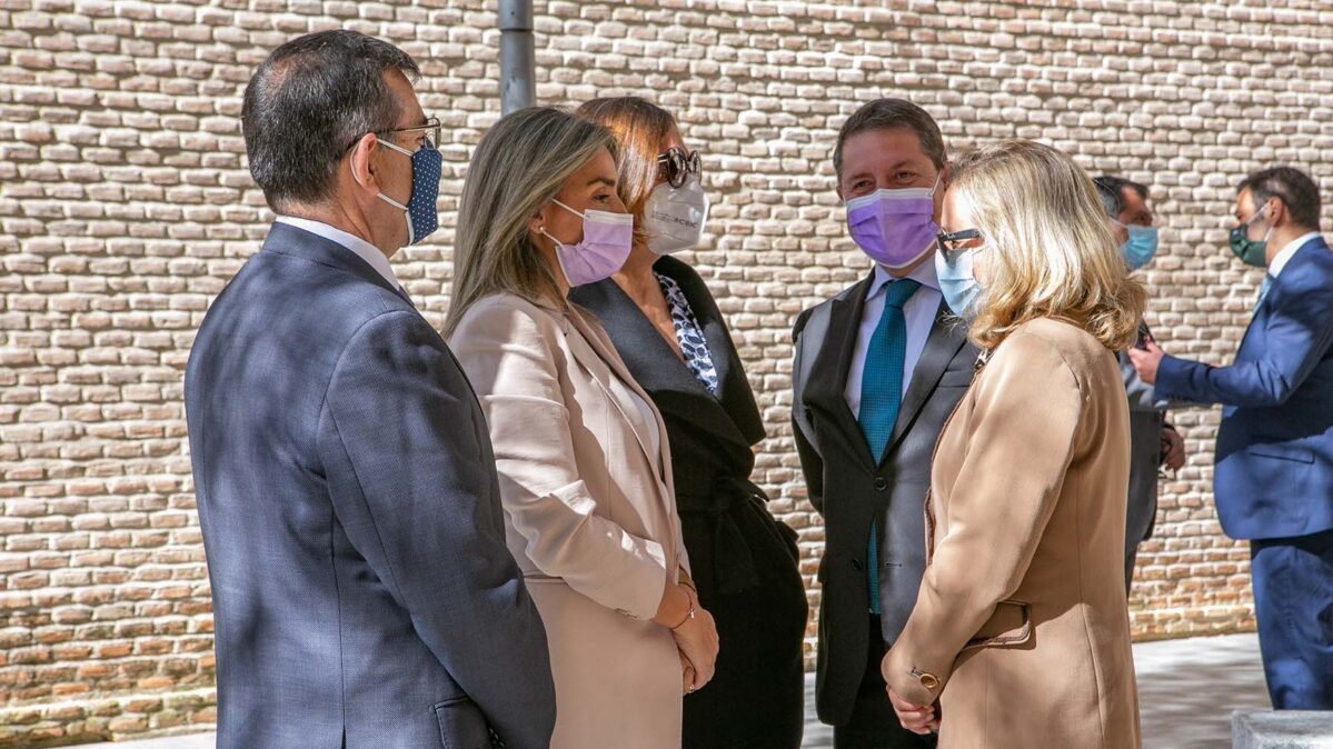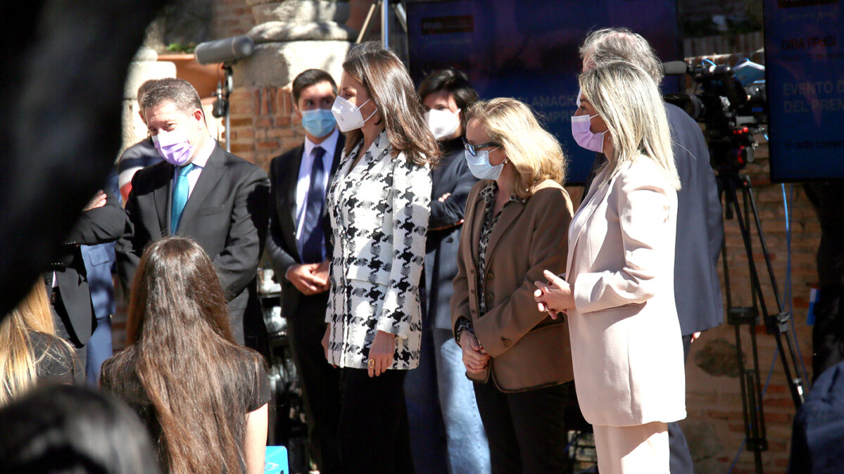 - GRAF6595. TOLEDO, 17/03/2021.- La reina Letizia (c) junto al presidente de la Junta de Comunidades de Castilla-La Mancha, Emiliano García-Page (i), durante su visita este miércoles a Toledo para asistir al acto de proclamación del ganador del premio «Empresa 2021». EFE/ Imael Herrero