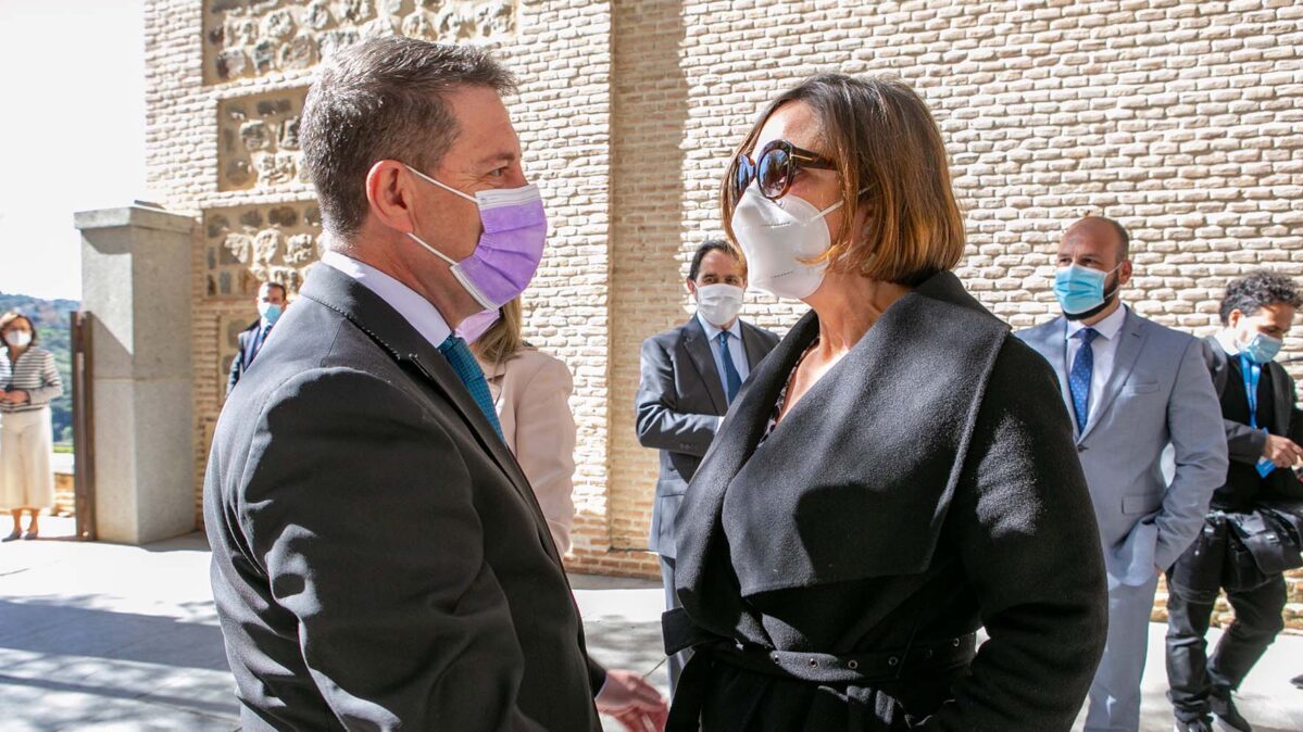 - GRAF6595. TOLEDO, 17/03/2021.- La reina Letizia (d) es recibida por el presidente de la Junta de Comunidades de Castilla-La Mancha, Emiliano García-Page (c), durante su visita este miércoles a Toledo, donde asistió al acto de proclamación del ganador del premio «Empresa 2021». EFE/ Imael Herrero