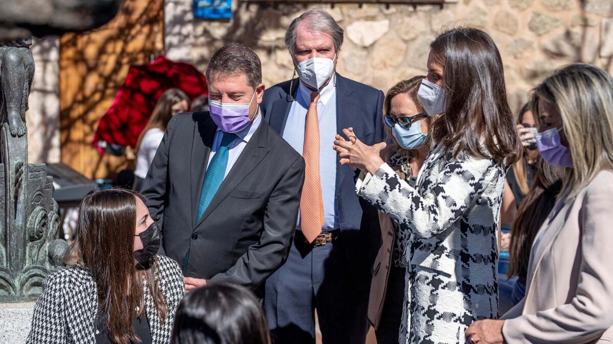 - GRAF6595. TOLEDO, 17/03/2021.- La reina Letizia (2-d) junto al presidente de la Junta de Comunidades de Castilla-La Mancha, Emiliano García-Page (i), durante su visita este miércoles a Toledo para asistir a la proclamación de los premios Princesa de Girona. EFE/ Imael Herrero