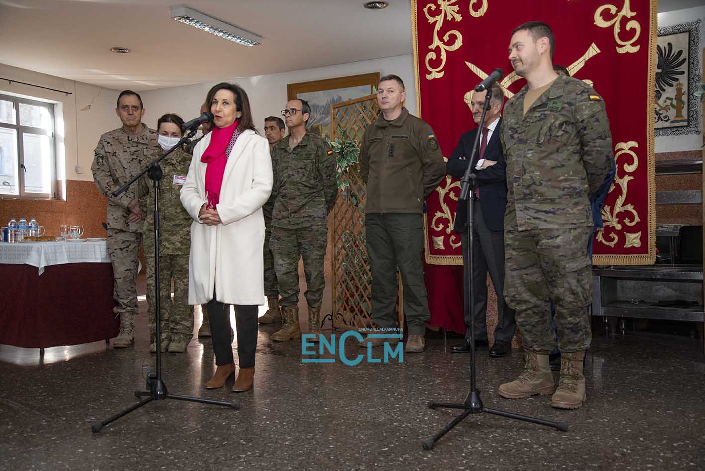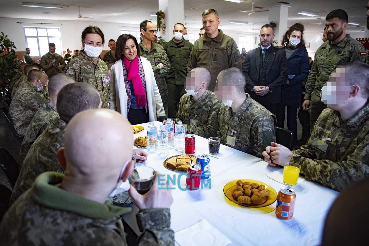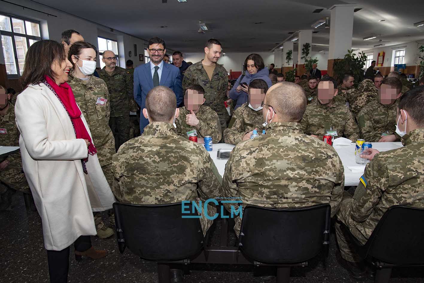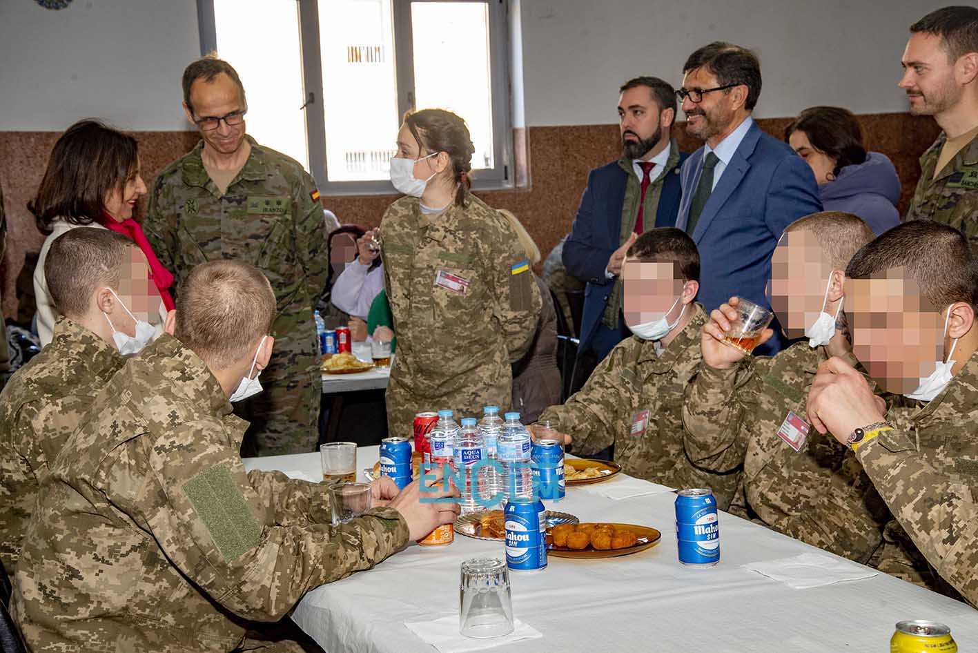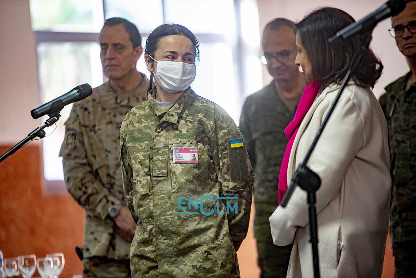 - Margarita Robles, ministra de Defensa, junto a una militar ucraniana en la Academia de Infantería de Toledo. Foto: Rebeca Arango.