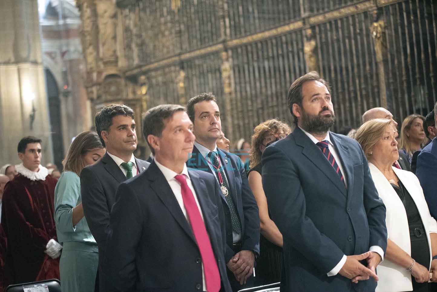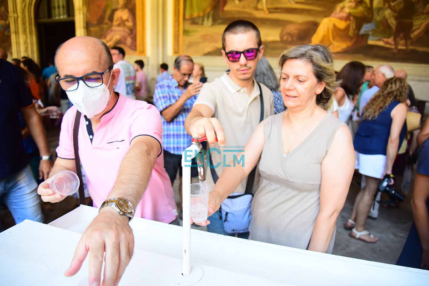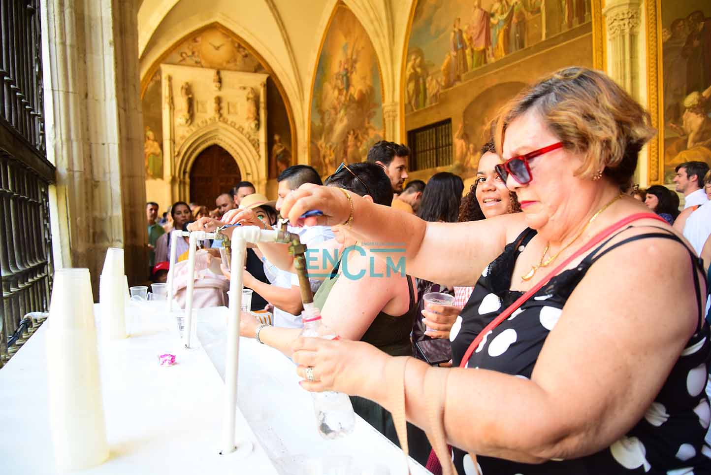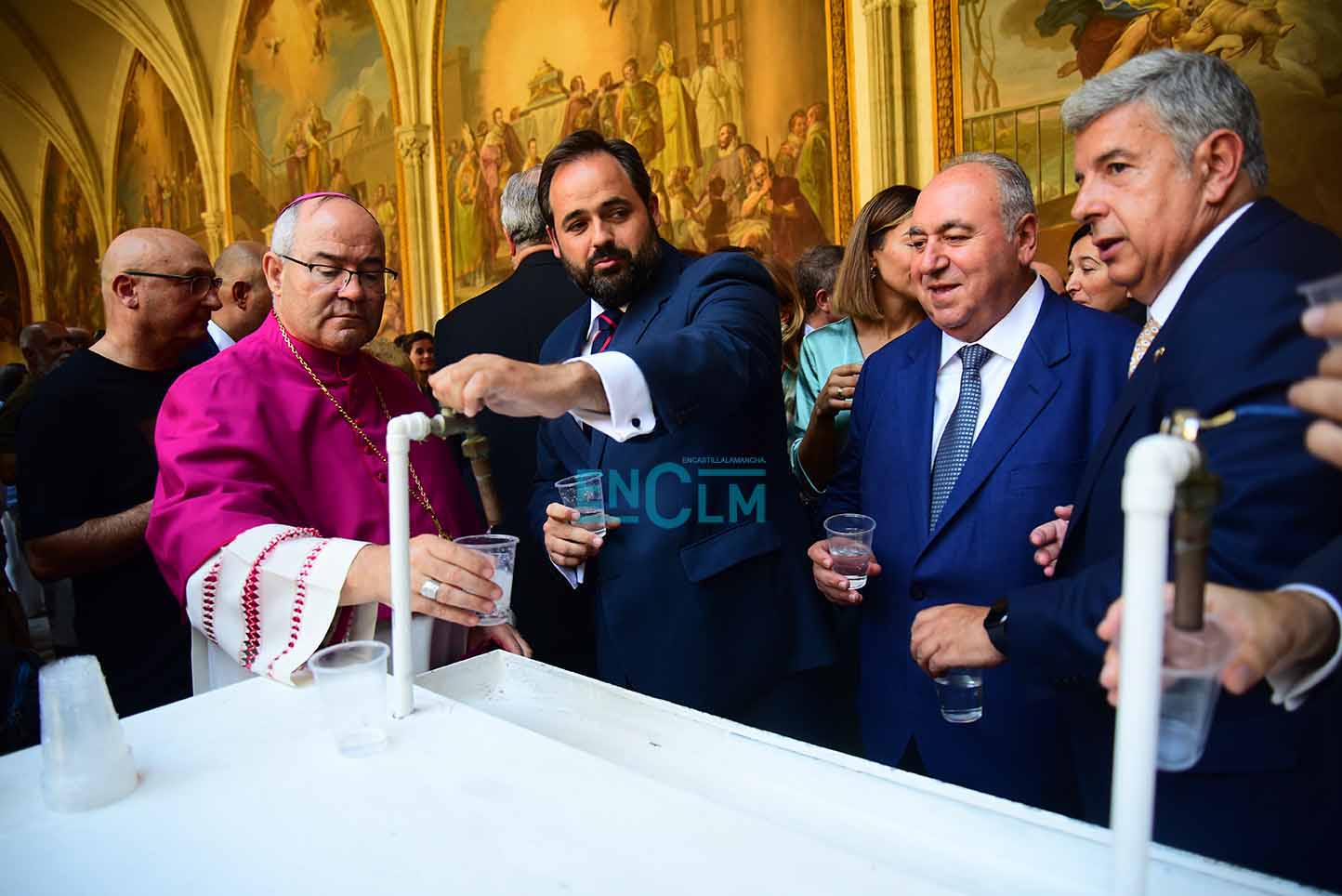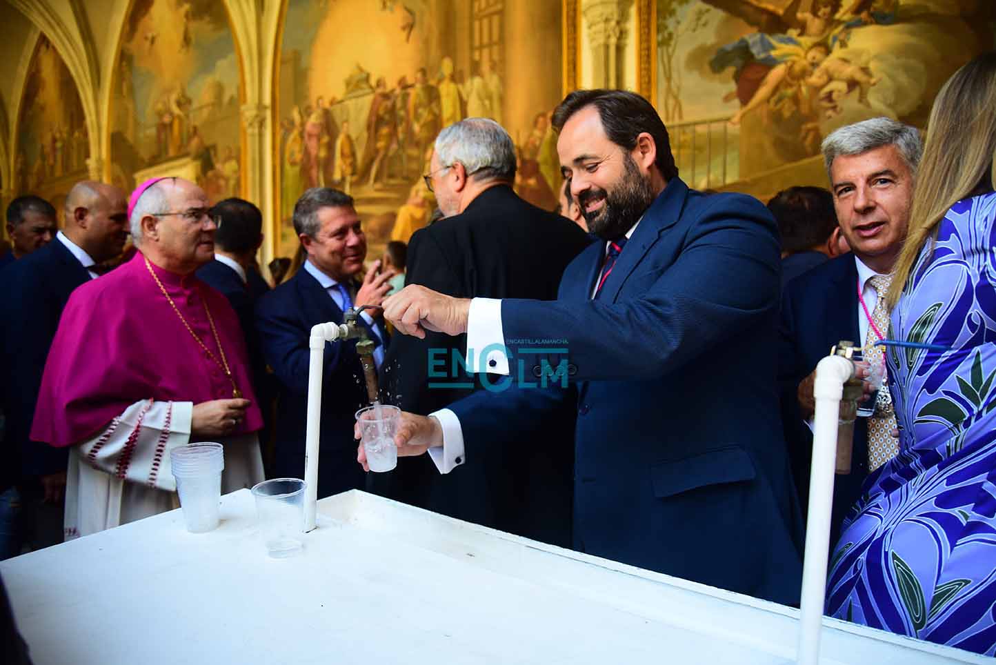 31 de 107Page, junto a la alcaldesa de Toledo, Milagros Tolón, bebiendo el agua (no de los botijos y sí en vasos) en la Catedral de Toledo. Foto: Rebeca Arango.