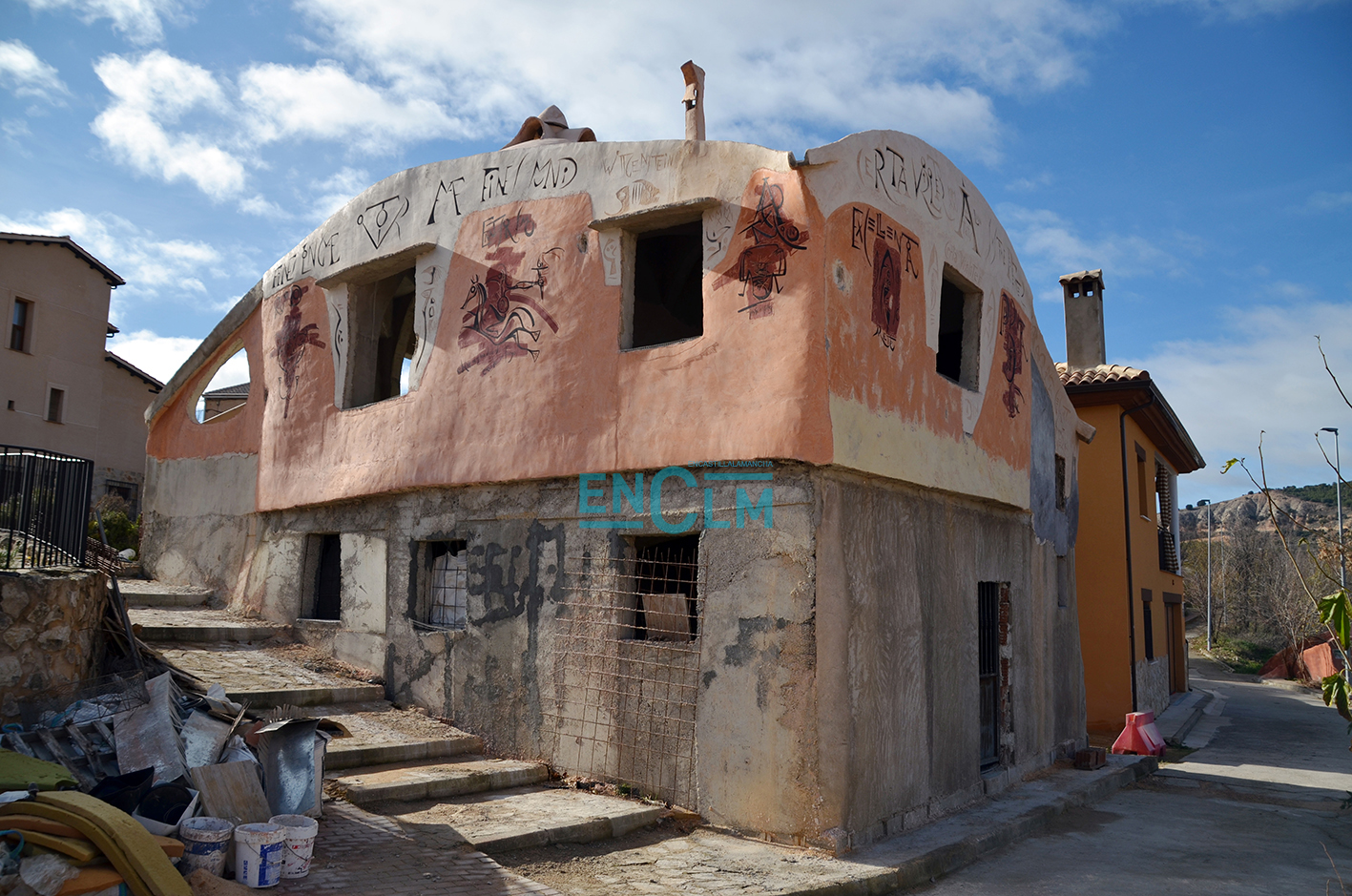 «Si me dices que estoy dejando el pueblo bonito es que no estoy haciendo mi trabajo», nos dice nada más conocernos el artista que en Olmeda de la Cuesta tiene su laboratorio de pruebas perfecto, sino fuese porque «aquí hay que estirar los duros«.