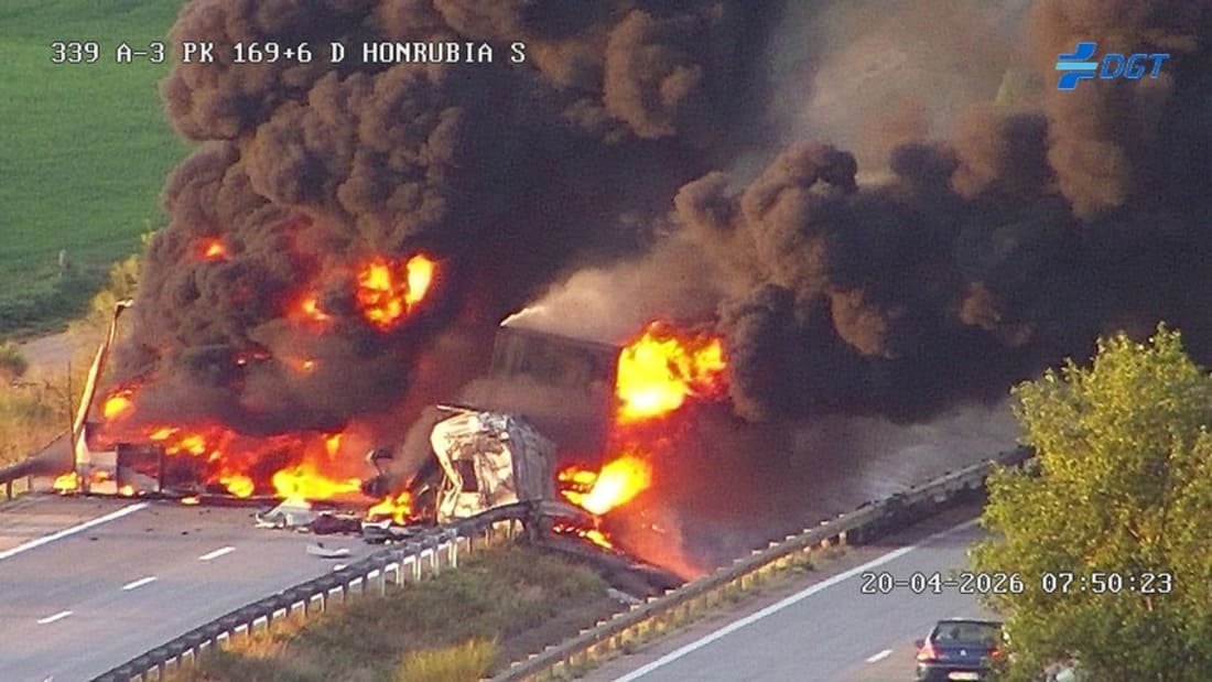 El aparatoso accidente se ha producido al chocar dos camiones, que se han incendiado, como puede aprovecharse en la foto de las cámaras de la DGT que acompaña esta noticia.